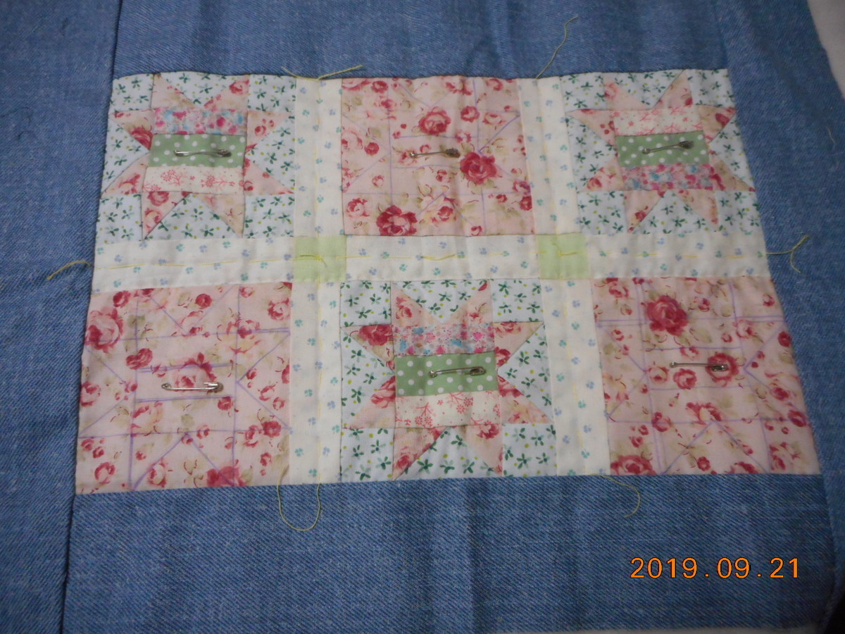 写真はOKDさんのアルバムスターのキルト=小さなつなぎを3枚とキルティングラインのアルバムスター記入~キルティング前の糸しつけ~縦横ラインからキルティングはじまり!