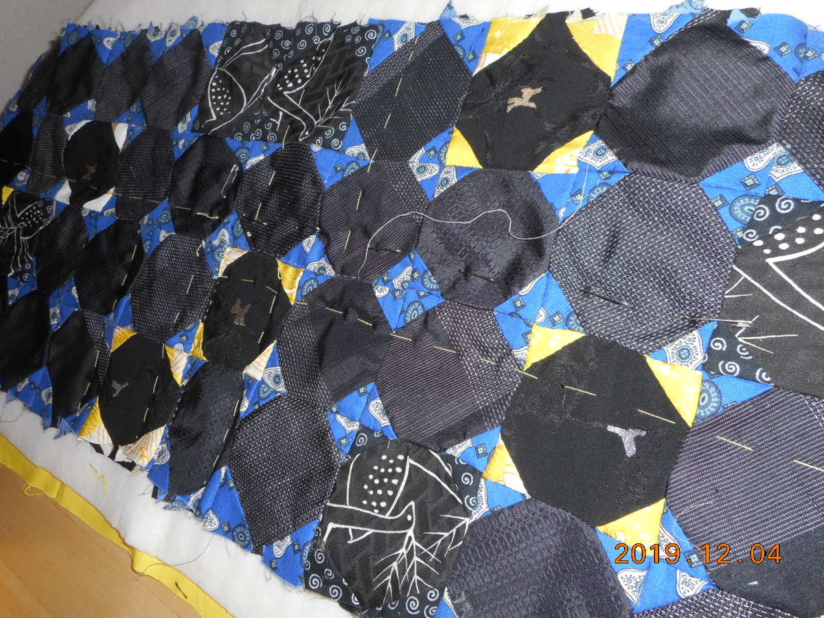写真はUMKWさんの8角形+3角形=4角形のバック~全体つながりキルティングの為 糸しつけ+ピンしつけ=丁寧に進まれています