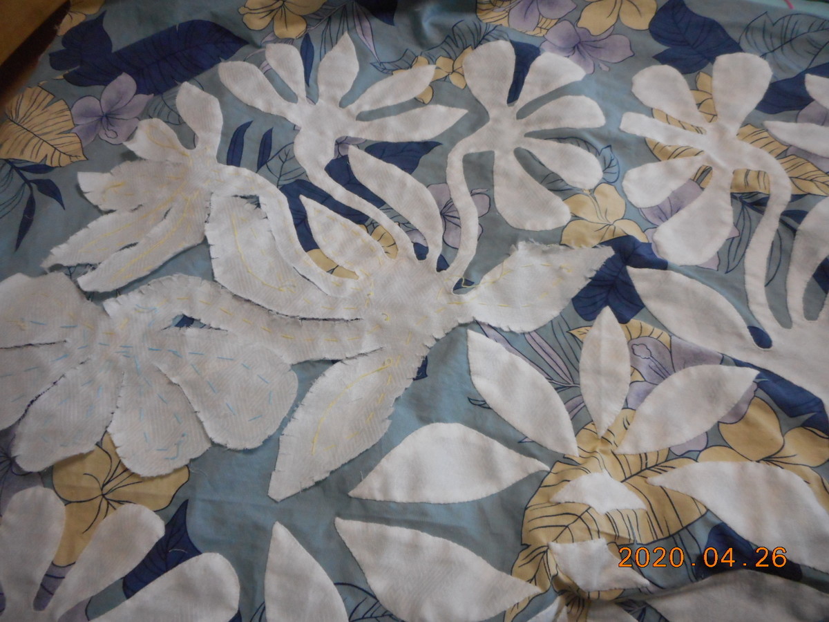 ハワイアンキルト=ナウパカお花16中15目アップリケ縦まつりに進みます