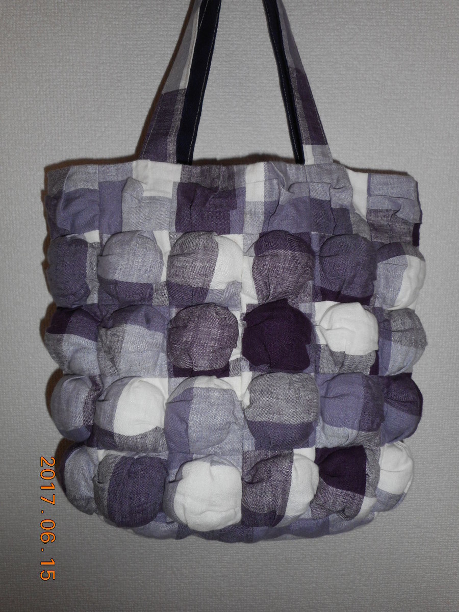 写真はKBYSさんのパフのバック見返しで持ち手をはさみ付けその後バック口辺りにも綿を詰めます=大きめチェックを使われてオリジナルな仕上がりです(今日も無事に書けました)