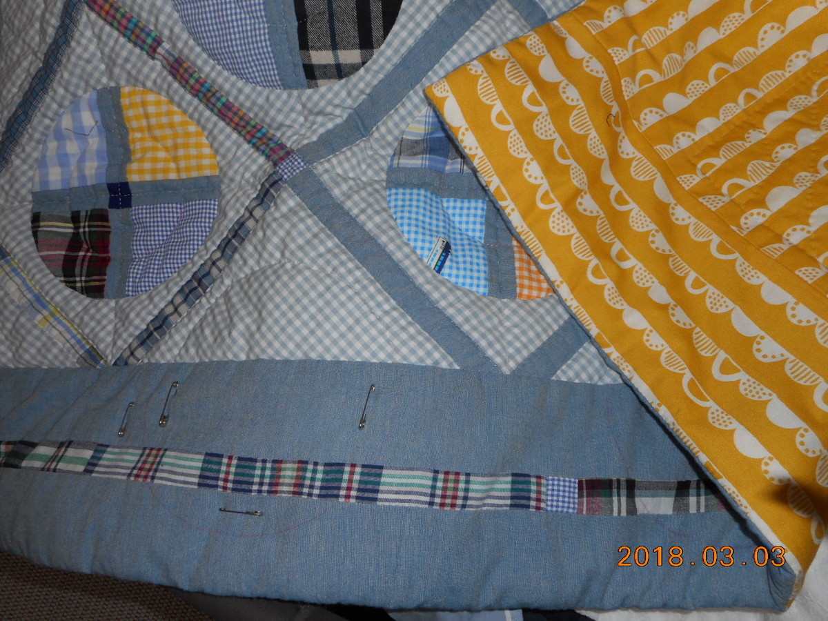 チェックと丸のキルト=周りの仕立てはパイピング無しで仕上げキルティングは今から?です