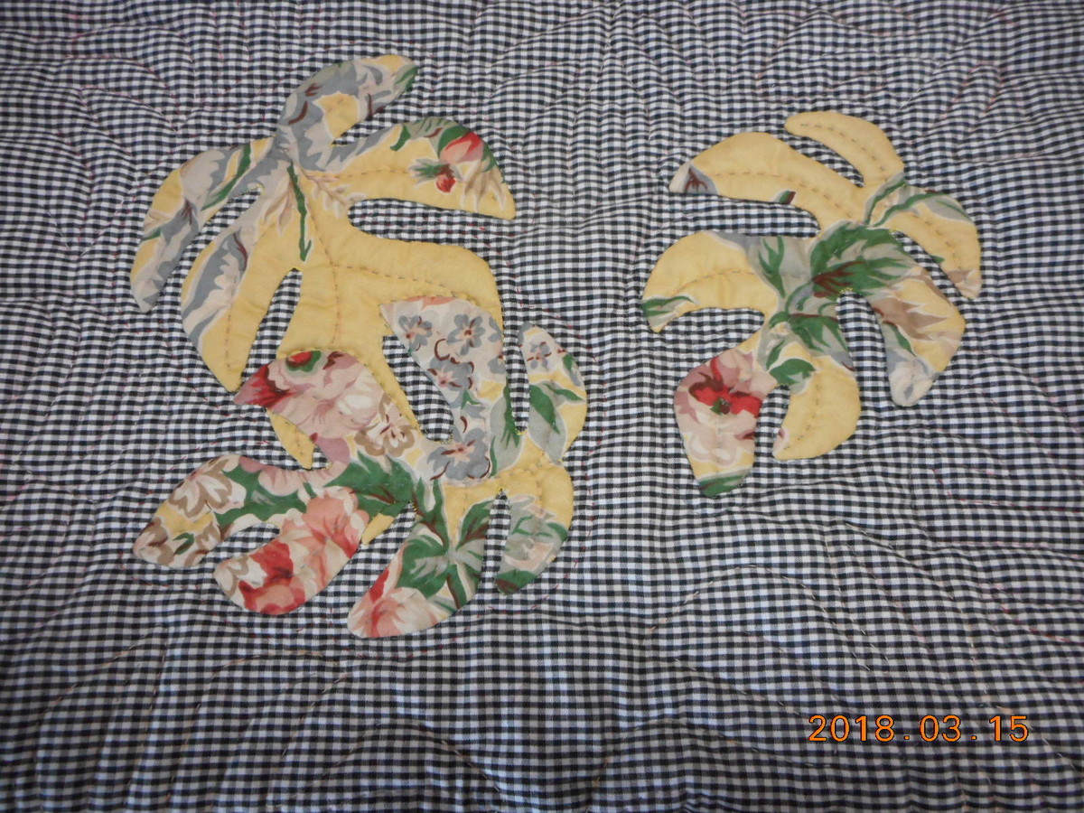 2022-03-17 地震長く揺れた~~ 写真はTKOKさんのハワイアンキルト=姫モンステラ葉脈などキルティングが丁寧に入りバックに仕立て予定 ~~~~~~ 医療従事者に感謝して感染対策続けます 大きな地震が有ると益々医療現場は 大変ですね=ご自愛下さい ~~~~~ 11年前を思い出しました 何度も揺れてこわかった 生後1ヶ月のベビーはベッドですが 2歳の子は大人が揺れる電灯で地震を 確認していると~おんぶ紐を持ってきました=2歳とは言え話を良く聞いてたようです