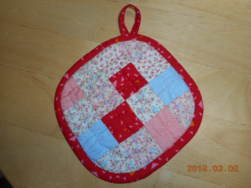 写真はKWDさんの四角つなぎ=鍋つかみ完成~初めてのつなぎ+キルティング+パイピング丁寧にコツコツ進められました~鍋つかみ熱く無い様にキルト芯に綿ジャージをプラスしています