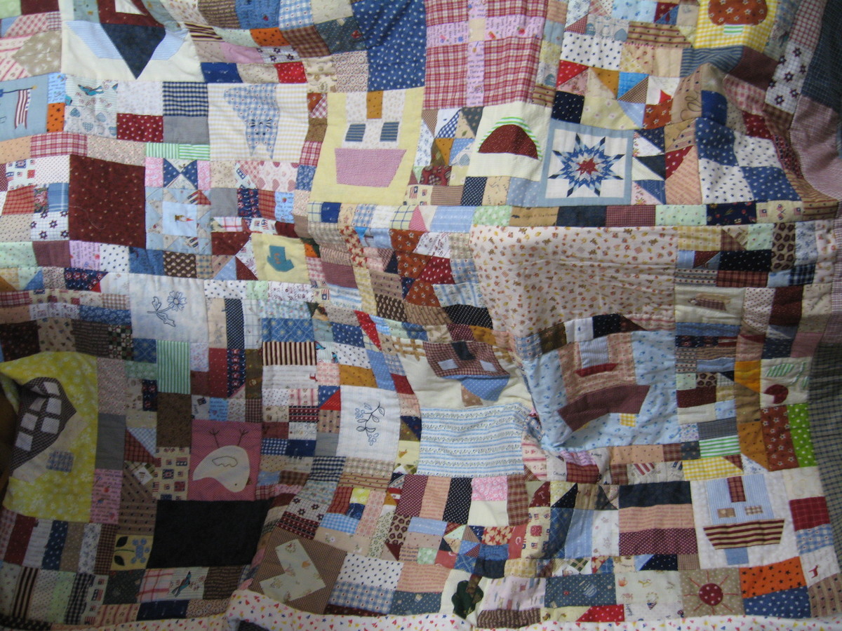 写真はKMYさん~大きなベッドカバー~裏地とキルト芯にキルティング兼ねた繋ぎです~それぞれの布にも パターンやアップリケ等~手抜きなく丁寧です